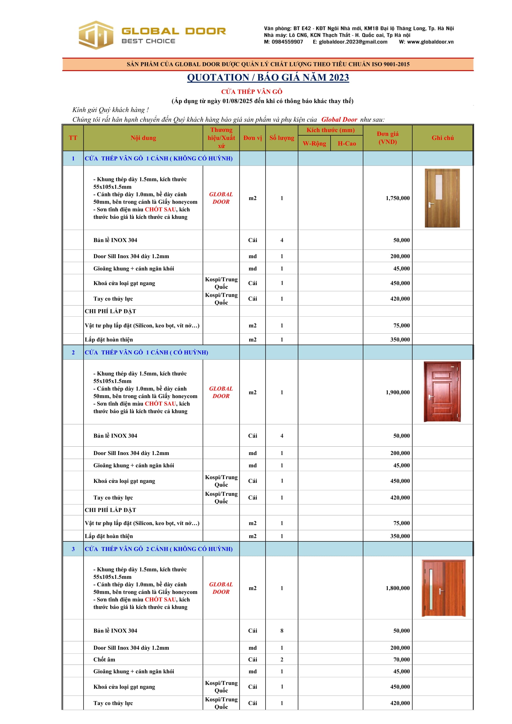 Báo giá các loại là một trong những yêu cầu nhận được nhiều sự quan tâm của người tiêu dùng đang có nhu cầu sử dụng sản phẩm này. Dưới đây, Global door xin gửi đến quý khách hàng bảng báo giá cửa thép vân gỗ an toàn mới nhất năm 2025. Chúc cho quý khách hàng tham khảo và chọn lựa được sản phẩm phù hợp với chi phí tốt nhất.