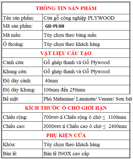 Giá cửa Plywood 08 phụ thuộc 3 nhóm: cốt cánh, bề mặt, phụ kiện (kèm kích thước).