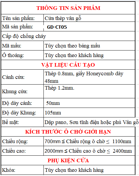 Chống cháy lan: Một trong những lợi thế lớn nhất của cửa thép là khả năng chống cháy. GD-CT05 có thể chịu được nhiệt độ cao trong một khoảng thời gian nhất định, giúp ngăn chặn sự lan truyền của đám cháy, tạo điều kiện cho gia đình có thêm thời gian thoát hiểm.