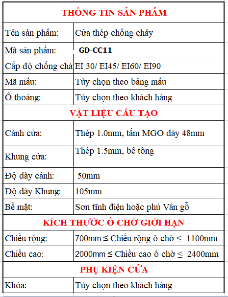 Cửa thép đơn chống cháy 11 - GD-CC11 không chỉ là một sản phẩm, đó là sự kết tinh của công nghệ tiên tiến và nghệ thuật chế tác tinh xảo. Sản phẩm này giải quyết mọi nỗi lo của bạn, mang lại một cánh cửa vừa đẹp, vừa bền, vừa an toàn tuyệt đối.